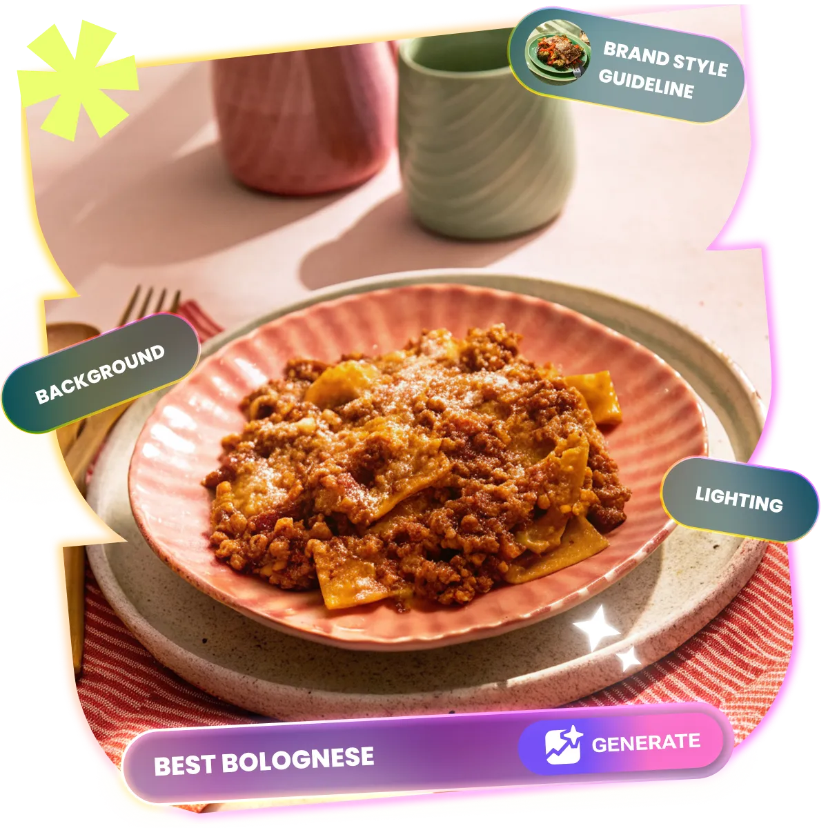 Integrate branded products into your AI-generated food images for marketing and promotional use. Customize how your product appears to match your branding strategy.
