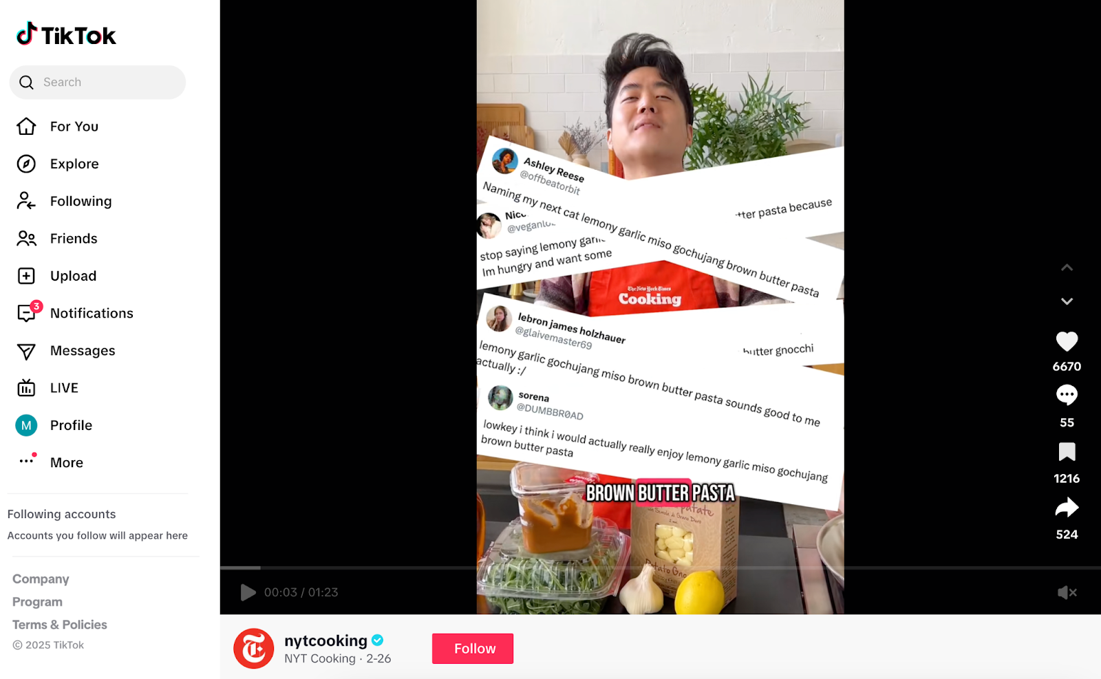 TikTok makes it easy to learn a recipe in under a minute through short-form videos. Trends like "What I Eat in a Day" and fast-paced cooking hacks shape daily meal ideas. TikTok’s algorithm pushes relatable, bite-sized content to users, making it a natural fit for recipe discovery that feels both personal and aspirational.